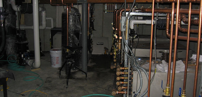 59-ton Hydron Module Geothermal Water-to-Water System (34-ton water-water, 6-ton Split System Make-up Air Unit, 19-ton Water-Air Units for Heating and Cooling), B&D HSS Buffer Tanks, B&D Smart Pump